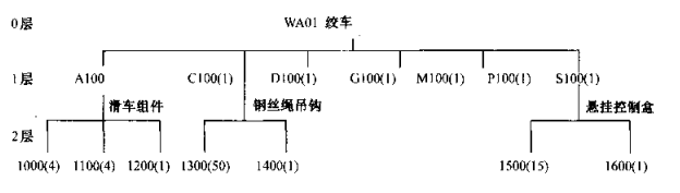 2. 产品结构中的层次关系。图2表明了WA01的层次结构。这是一个三层的树状结构,第0层是最终产品WA01本身,第1层是它的直接组件,第2层是组成直接组件的零件。在表述中也常常用“父项”“子项”这样的术语来说明不同的物料在产品结构中的层次关系。例如途中SA01作为父项,第1层上的所有物料均有其子项;如果把A100作为父项,则1000、1100、1200都是其子项。括号中的数字指明构成一个父项所需要的改子项的数量。